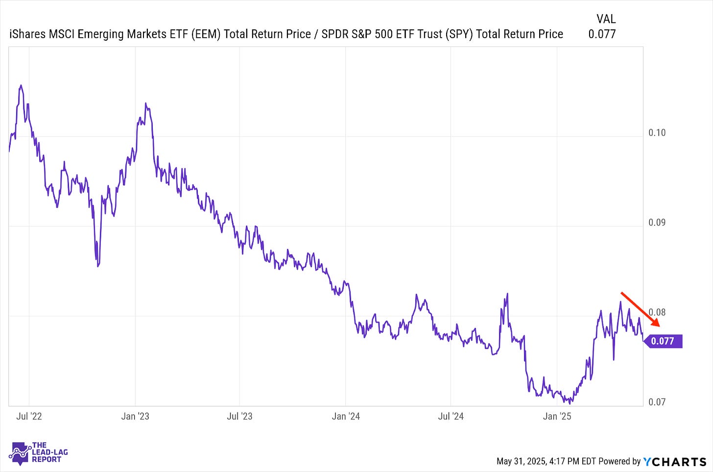 Emerging markets have mostly moved sideways relative to the S&P 500 over the past few months, but the short-term trend has been moving lower. Chinese stocks have held up well this year despite the tariff-related turmoil, but it’s Latin America that’s really come through. Brazil, Chile, Colombia and Mexico are all up more than 20% year-to-date.
