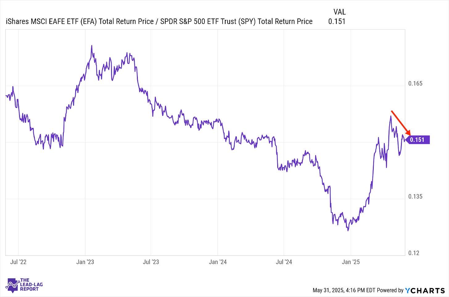 After a strong run to start the year, international stocks have mostly been able to hold on to outperformance, although the uptrend appears to be over for now. The market seems to view the Trump tariffs as potentially more damaging to the U.S. economy than those of its trade partners. With other nations also trimming interest rates and representing much better value, foreign stocks could have longer-term conditions working it their favor.