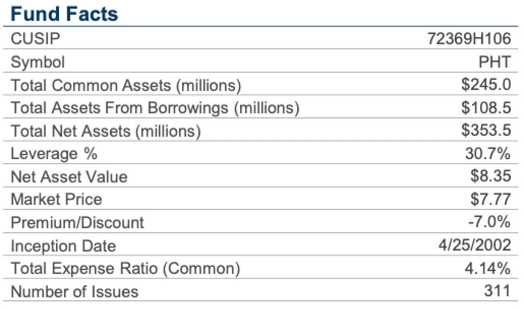 PHT’s primary objective is high current income with a secondary objective of capital appreciation. It does this by investing in a portfolio of below-investment grade bonds and convertible securities. The fund also utilizes leverage in order to enhance yield and total return potential.