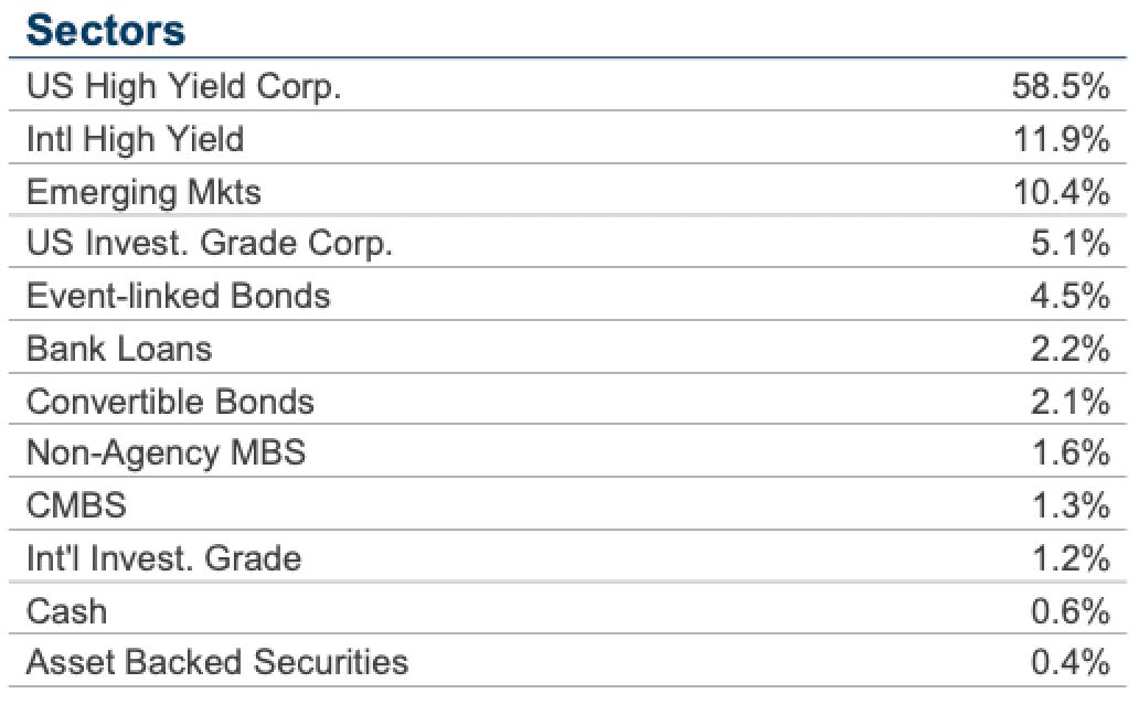 The first three categories listed above fall under the general umbrella of a global high yield bond portfolio and comprise the vast majority of the portfolio. The 5% inclusion of event-linked bonds (sometimes referred to as catastrophe bonds because they require some natural disaster or devastating event to trigger) is an interesting addition to the portfolio. They generally have big tail risk, but can be a nice source of yield. The remaining asset classes add a bit of diversification, but aren’t really needle movers.