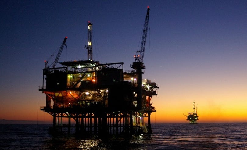 Platform Houchin offshore oil rig at sunset (BOEM photo). Energy companies face new opportunities as drilling restrictions are lifted.