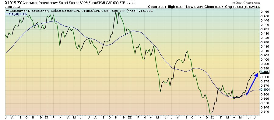 The consumer discretionary sector has replaced tech as the most consistent outperformer in this market. The positive sentiment supporting risk assets remains in place, but the strong labor market along with strong wage growth numbers has investors banking that the consumer can stay strong and keep spending well into the 2nd half of this year. This could be an example of people betting on positive short-term fundamentals as opposed to the potential of AI.
