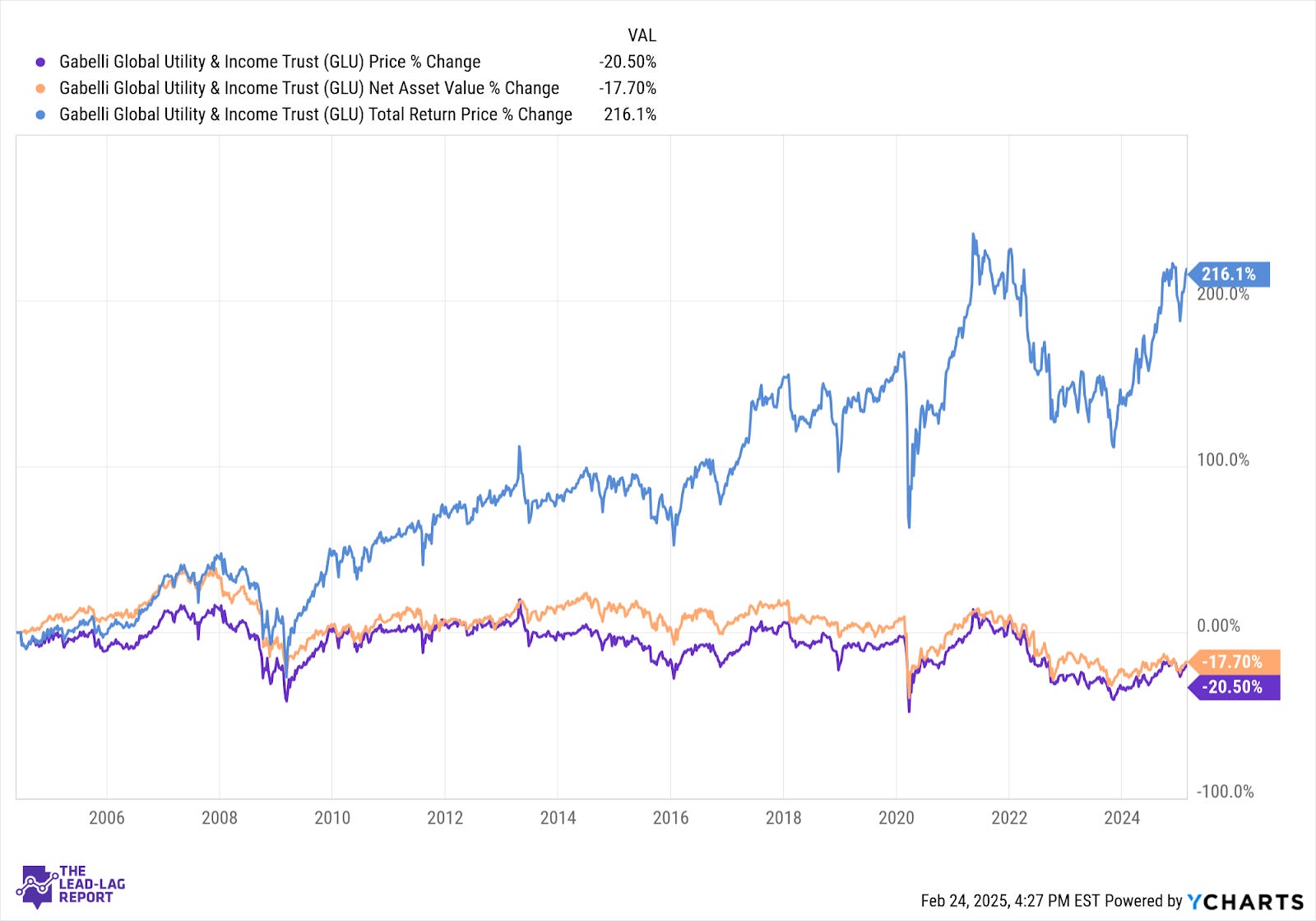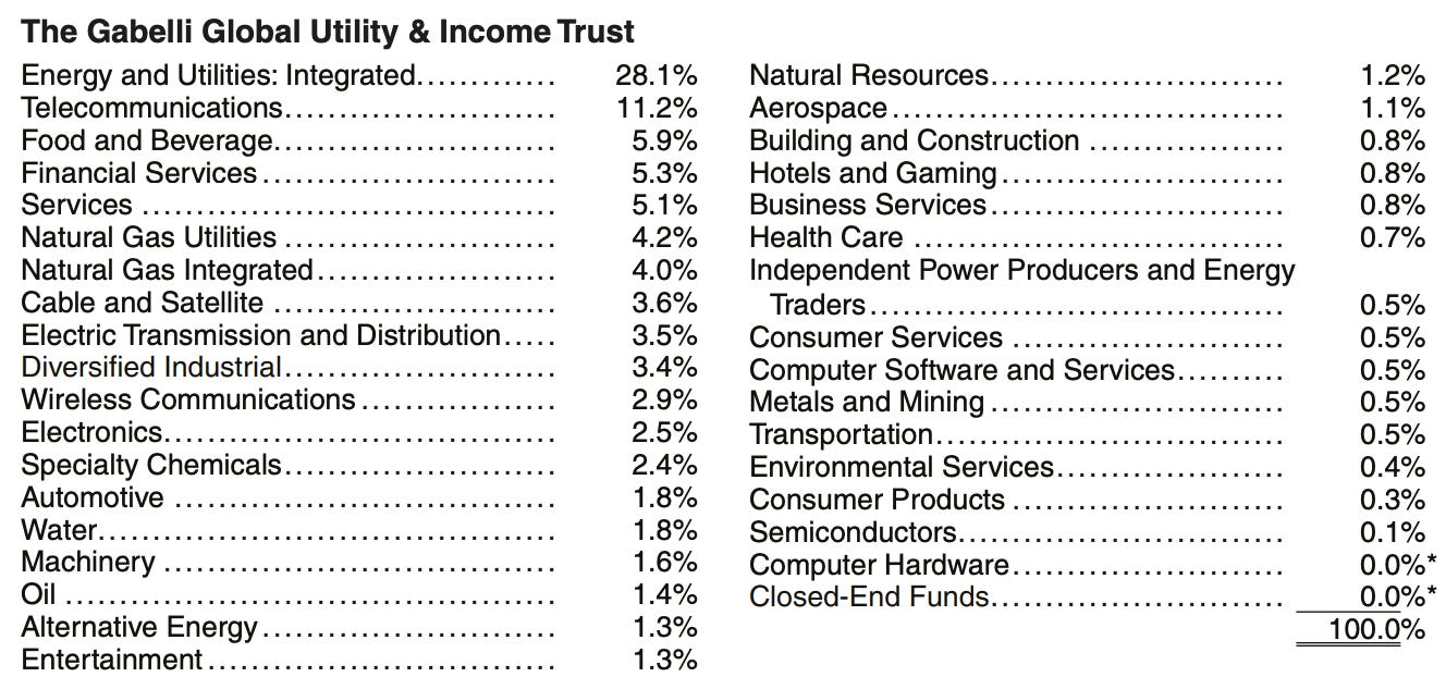 That’s why I want to take a look at the Gabelli Global Utility & Income Trust (GLU). Not only does it focus heavily on utilities and telecommunication stocks, it also includes a heavy dose of international stocks, an area of the market that’s been on a strong run over the past two months. If the U.S. economy is slowing down as multiple recent datasets suggest might be happening, this could be an ideal place to look for bargains.