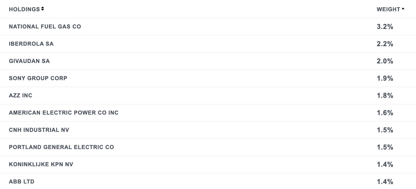 Among the top holdings, you’ve got some traditional American names, such as American Electric Power and Portland General Electric, along with a number of international names. Most of the biggest names are focused on utilities and telecoms with no particular idiosyncratic risk that’s obvious.