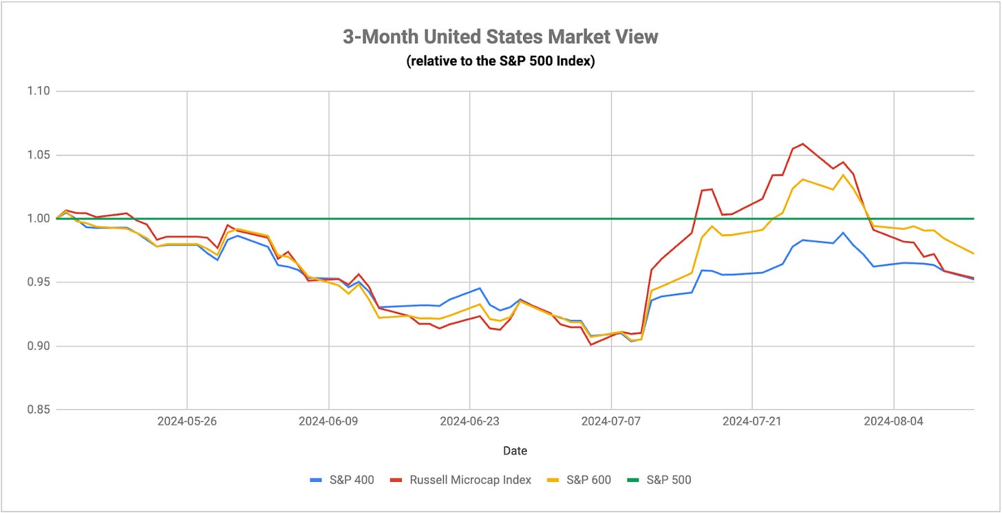 With regard to the former, we’ve seen small-caps within a month go from rotation beneficiary to risk-off asset. The event that triggered the huge rotation was a below expectation reading on U.S. inflation. Because U.S. growth was still viewed as largely positive at the time, equities were able to rally, but the sectors that did the rallying were changing. Value stocks, small-caps, cyclicals and defensives were the big winners, while previous leaders, including tech, were the big laggards. When the weak July jobs report was released, recession risk became the primary narrative and brought with it a strong risk-off pulse. That led to small-caps trailing large-caps again, which is what you’d typically expect in a regime of bearish sentiment. If small-caps keep trailing here, which is what’s consistently been happening since late July, it’s a stronger risk-off signal and a sign that the current rebound in equities may be a fakeout.