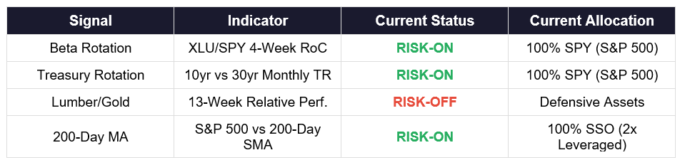 The framework reads 3-1 Risk-On this week, leaning offensive but no longer unanimous. After last week’s rare 4-0 clean sweep, one signal has broken ranks: Lumber/Gold has flipped to Risk-Off as gold surges past $4,800/oz while lumber prices decline. The remaining three signals — Beta Rotation, Treasury Rotation, and the 200-Day Moving Average — all remain firmly Risk-On. The S&P 500 closed at 7,126.05, its highest level since January, capping a blistering 4.5% weekly gain that pushed the index above 7,000 for the first time since early February.