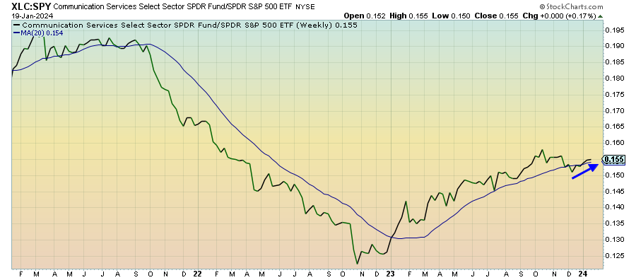 This sector has slowly and steadily been outperforming the S&P 500, but that’s all thanks to the power of Facebook and Alphabet. If you look at the equal weight version of this sector relative to the S&P 500, it’s been steadily underperforming further and further for more than a year. The “magnificent 7” exposure will inextricably link this sector to tech, but it’s actually looking quite weak here.