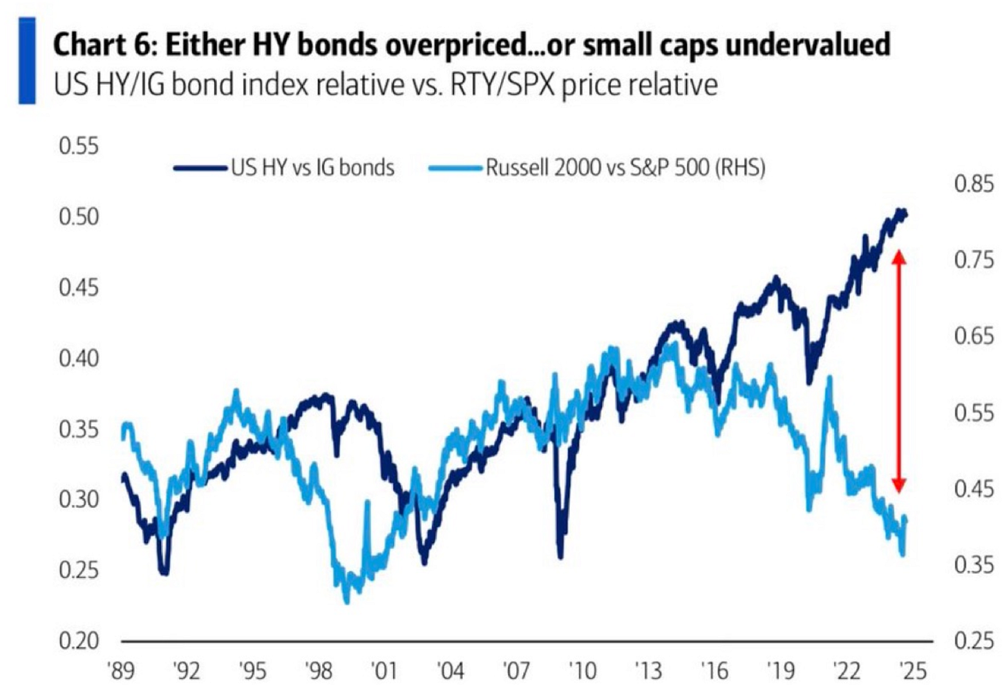 Looking back historically, small-cap outperformance and high yield bond outperformance have been closely correlated. That changed about a decade ago. Since then, junk bonds have consistently outperformed higher-quality bonds (with exceptions for the 2015 junk bond crisis and the COVID pandemic), while small-caps have consistently lagged their large-cap counterparts.
