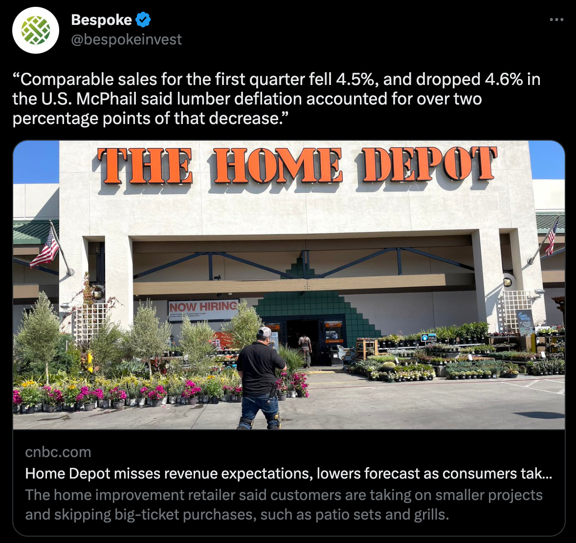 Home Depot said just this past week that roughly half of its quarterly decline in sales was due to falling lumber prices. A lot of companies won’t be as directly impacted by falling lumber prices as Home Depot, but we are seeing the generalized behavior in stocks that is consistent with a broader economic slowdown.