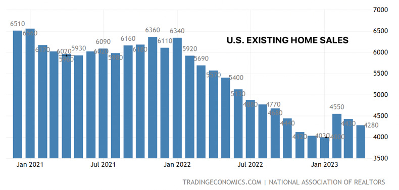 In early 2022, existing home sales figures started dropping at almost the same time that lumber prices started plunging. I’m not sure this trend has as much to do with lumber prices as it does mortgage rates. Higher rates have significantly reduced how much home potential buyers can afford and caused some to pull themselves out of the market altogether.