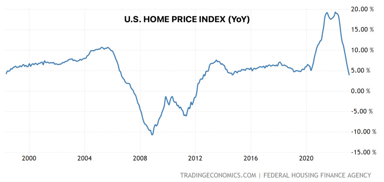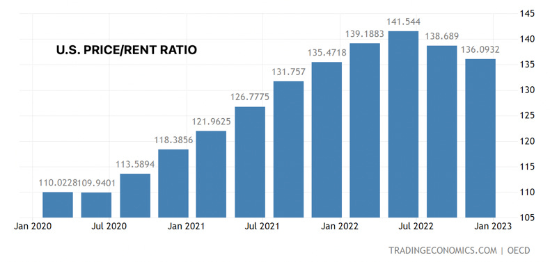 This ratio has been a function of both the numerator & denominator rising rapidly and has been a major variable in the high inflation problem over the past year. Today, both home prices and rental rates are coming back down. The latter was almost inevitable as rents were climbing at a clip of more than 10% year-over-year. As those 12 month leases start rolling over, rental rates are coming back down to earth.