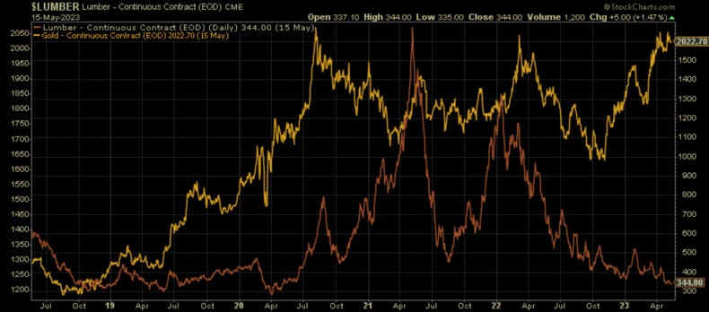 From an investment standpoint, the behavior of lumber in conjunction with the behavior of gold prices is concerning. The last time these two asset classes really diverged was in the second half of 2020 when we were just coming out of the COVID bear market and consumers were starting to swim in stimulus cash. Lumber shot higher and gold sank for several months, a signal which proved correct for risk asset prices.