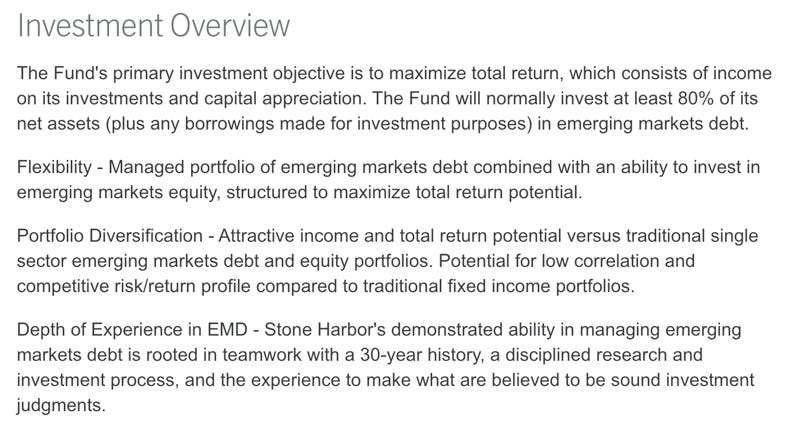 EDI’s investment objective is very straightforward. It aims to maximize total return, which consists of income and capital appreciation on its investments in emerging markets securities. It seeks to achieve its investment objective by investing primarily in emerging markets debt. It also utilizes leverage in order to enhance yield and total return potential.