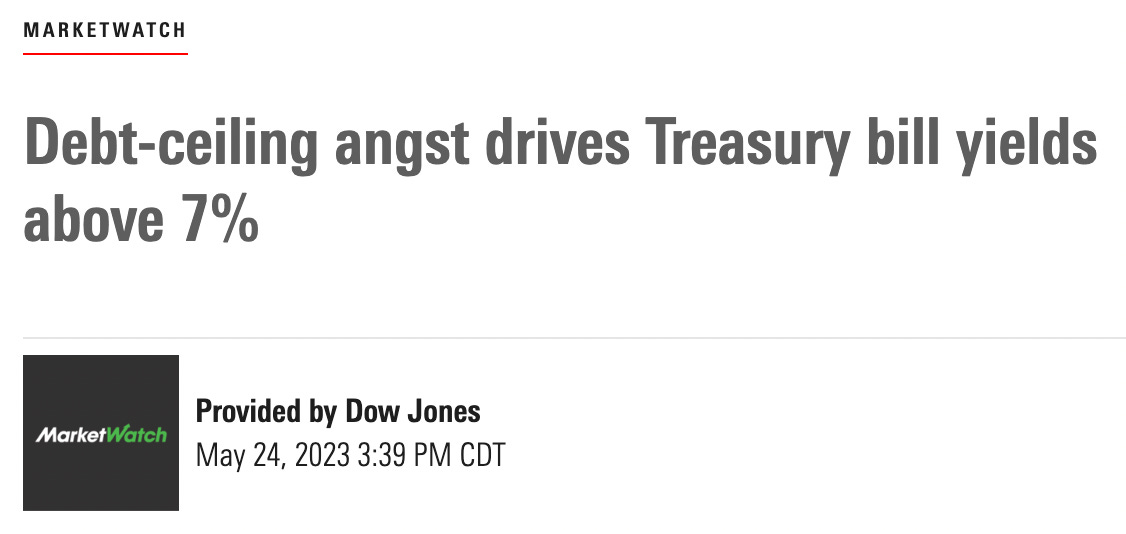 The debt ceiling debate in Washington is another great example of a short-term narrative. With about a week to go until the June 1st deadline, the equity markets have been pretty nonplussed throughout, but the bond market is finally getting a little shaken.