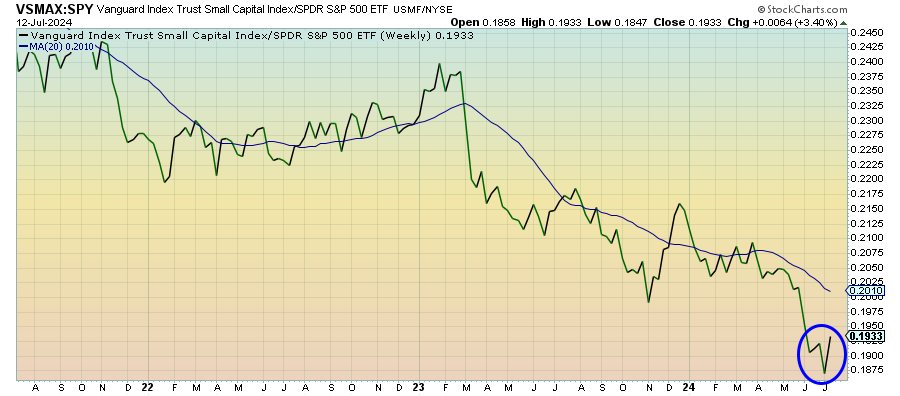 If last week did mark a turning point for U.S. stocks, the potential for small-caps relative to large-caps is HUGE. Maybe not because they’ll outperform in a falling rate/slowing economy environment, but because they fall less. It would be a similar pattern to what we saw in 2022 when small-caps outperformed the S&P 500 even though stocks, in general, were dropping by 20%. The value factor made a big difference in holding this group up.