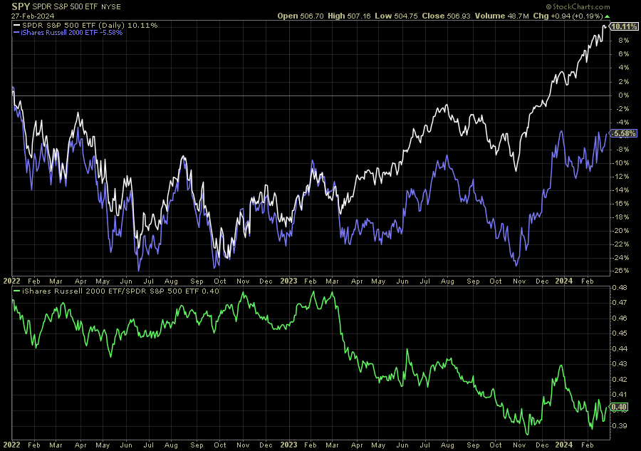 Doesn’t really make sense if we’re in a new bull market and we keep hearing about how strong the U.S. economy is. Perhaps this is something that rights itself over time, but we really should have seen some kind of extended run for small-caps over the past couple years. There was a strong run in the 4th quarter of last year when the Fed started to telegraph its intentions to cut rates in 2024, but that rally was completely walked back by February.