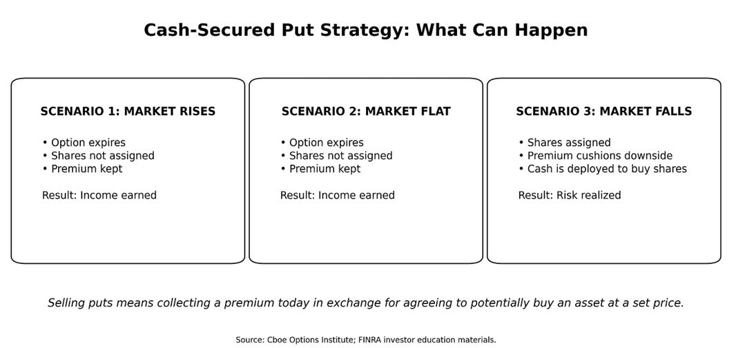 Cash-secured put strategies work in the opposite direction. Investors sell put options on assets they would be willing to own, collecting premium while agreeing to buy shares if prices fall to a predetermined level. When markets remain stable, the income is retained without ownership changing hands. When markets decline, the premium received can help offset losses on the acquired shares.⁷