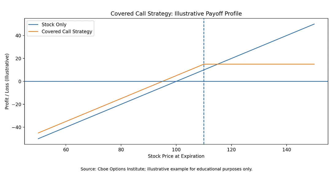 At their core, options income strategies involve collecting premiums in exchange for taking on defined obligations. Covered calls are the most widely recognized example. An investor who owns shares can sell call options against those holdings, receiving upfront income. If the stock remains below the strike price, the option expires worthless and the investor keeps both the premium and the shares. If the stock rises sharply, the investor may have to sell at the strike price, giving up some upside in exchange for the income received.⁶