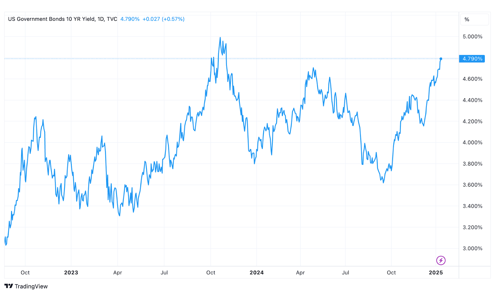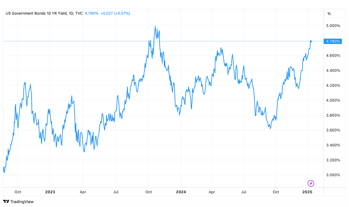 The trio of catalysts I just laid out do a pretty good job of explaining the behavior in the Treasury market, so there hasn’t been much need to search for alternative or additional explanations. But there’s one thing that I've been thinking about. Even when inflation was topping 9%, the 10-year yield only topped out at 5% (and that was about a year after that rate was hit). Why is the 10-year yield approaching that level again today even though the inflation rate is only 2.7%?