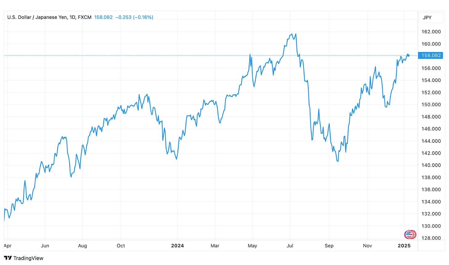 Of course, that’s not surprising given how yields are tied to the dollar, but it’s the fact that it’s gotten all the way back to 158 that’s notable. Historically, the Bank of Japan has been inclined to consider yen intervention around the 150 level. That’s traditionally been a soft cap for the yen because the market believed the BoJ would step in around that level to support it. In several cases, they’ve been right.