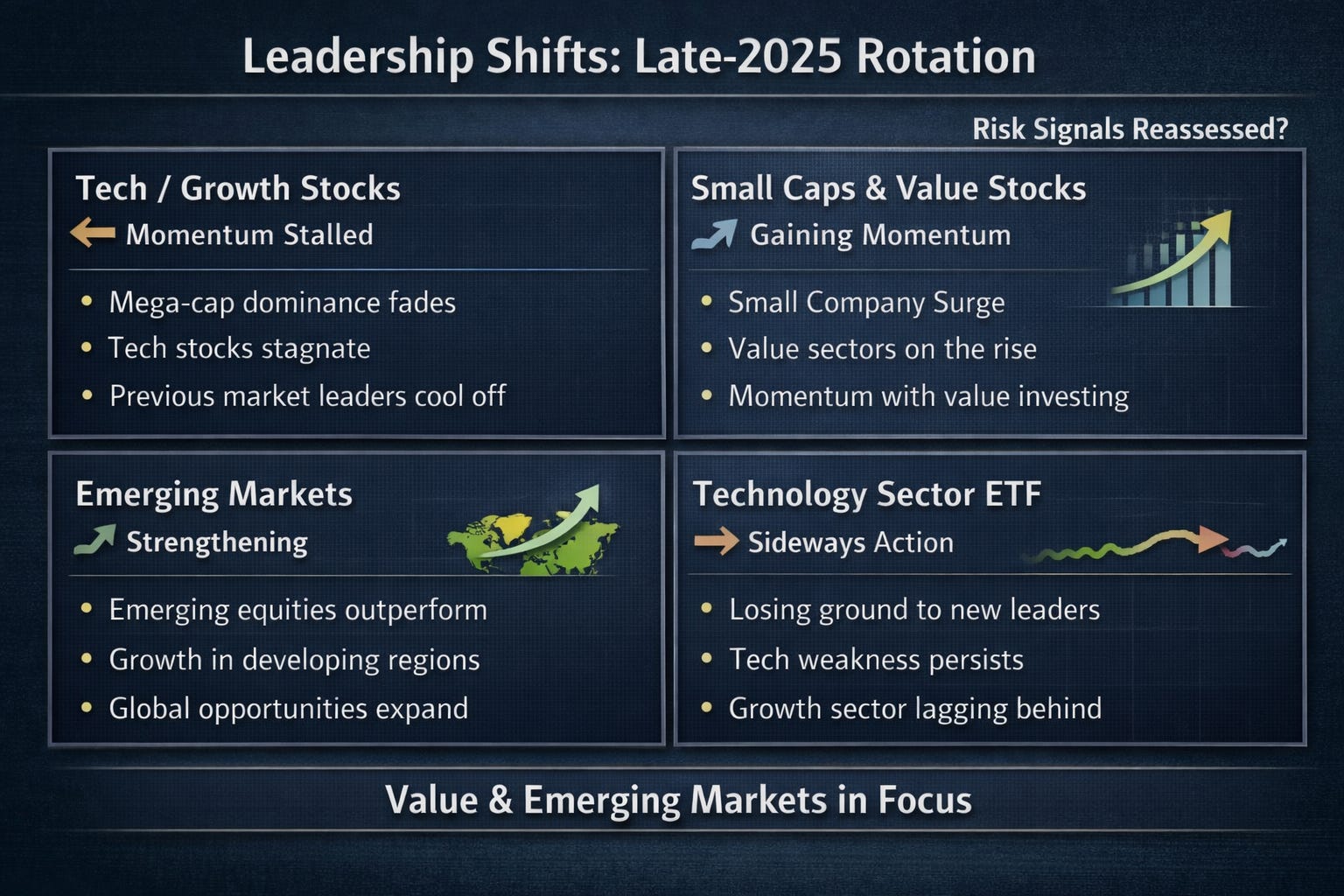 Market leadership in 2025 has shifted away from mega-cap growth stocks toward small-caps, value-oriented sectors, and emerging markets.