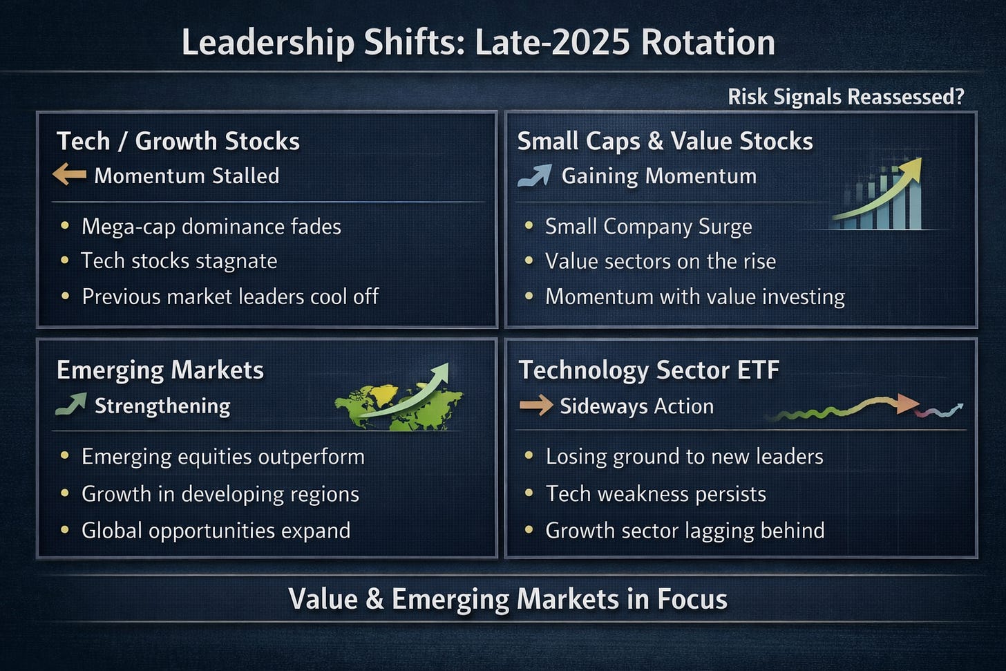 Small-cap and emerging-market strength has historically aligned with risk-on environments, reinforcing signals used by tactical strategies.