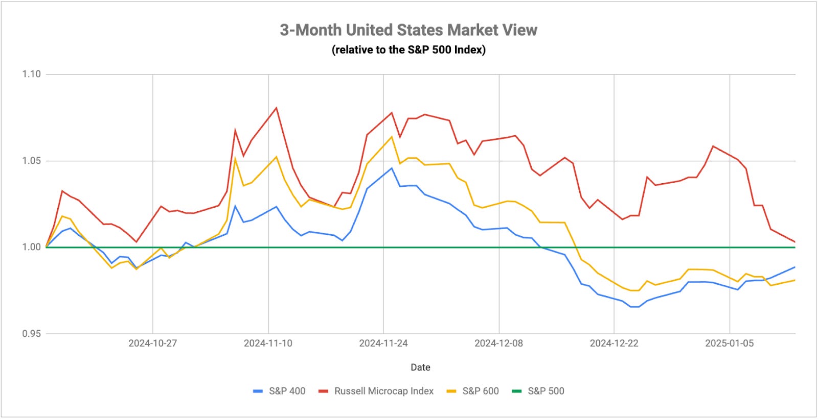 Within U.S. equities, there are signs that investors are getting a little more cautious. Utilities and healthcare have gotten off to relatively strong starts to 2025 and those are two sectors that generally do the best job of indicating investor sentiment. The problem is that they’ve yet to get confirmed broadly (consumer staples, low volatility and dividend stocks have all continued to underperform). While bonds look like they’re doing a fairly good job of reflecting inflation risk here, small-caps have been doing a better job of reflecting default risk. They’ve been making minor improvements relative to large-caps in recent weeks, but the dive in micro-caps from the chart above is telling. This is likely the first group to fall should worsening credit conditions start to get priced in. The fact that they underperformed badly even as small-caps and mid-caps held firm could be a problem.