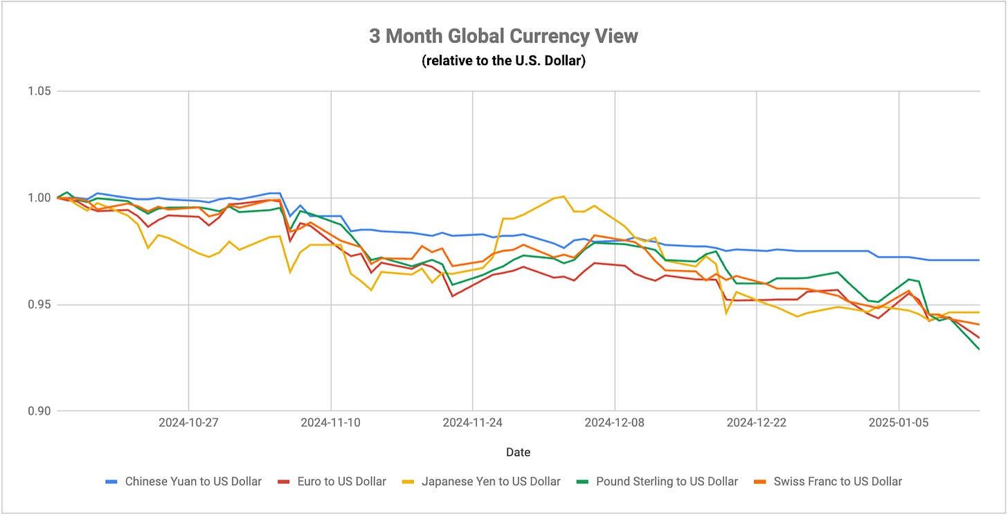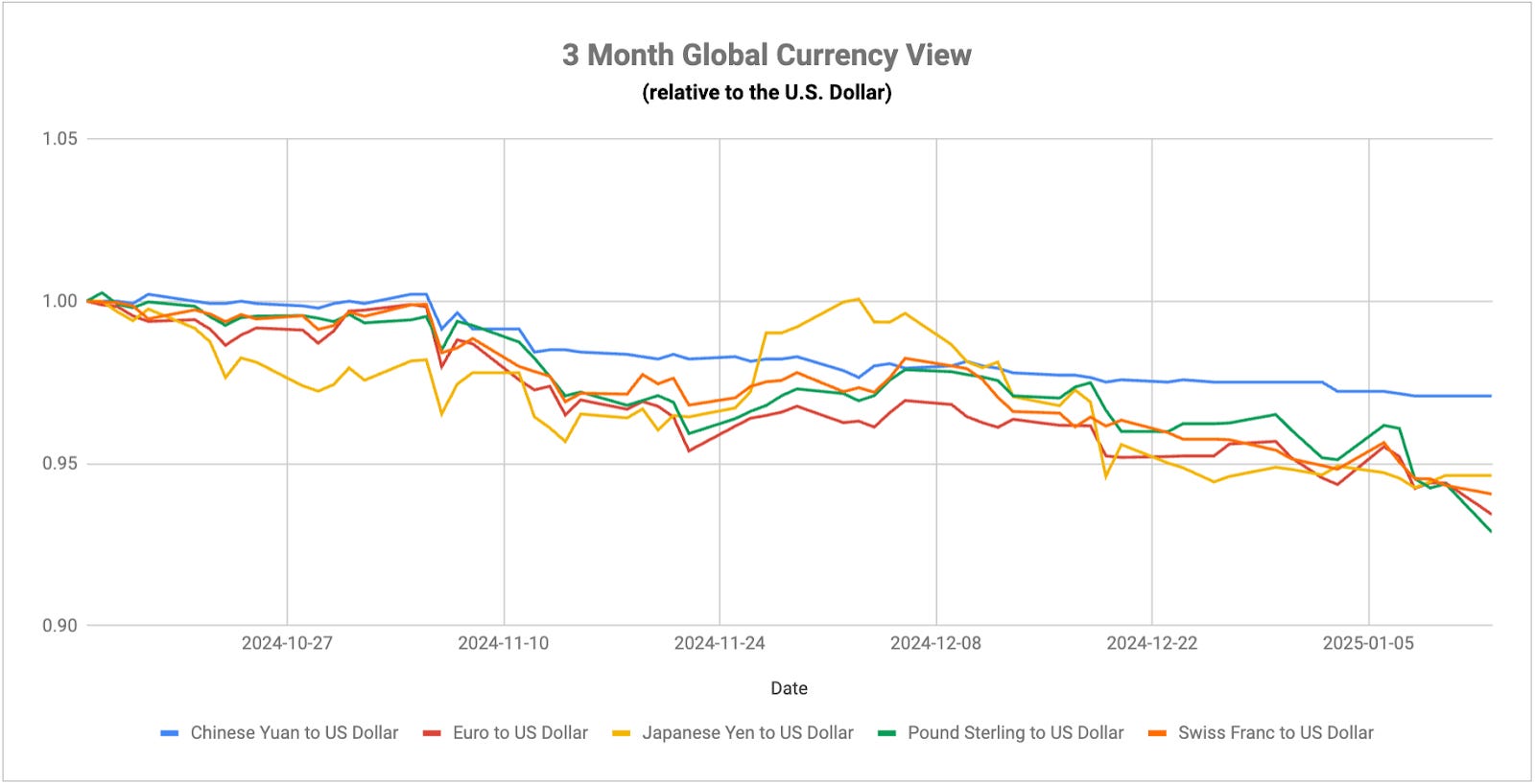 Speaking of which, China is one of those countries stepping in to support the yuan. It recently pledged its support for the currency by adjusting some capital control measures, but like its support for broader economic stimulus measures, most of this has been talk with little action. The yuan weakened further as its 10-year yield dropped from 2.2% at the end of September to nearly 1.6% today as Chinese investors appear to be heading for safe havens amid the current turbulence. That’s resulted in the Chinese central bank putting a halt on bond purchases to avoid further downward pressure on yields and the yuan. None of this is terribly surprising, but it does a fairly significant amount of risk to market very early on in 2025.