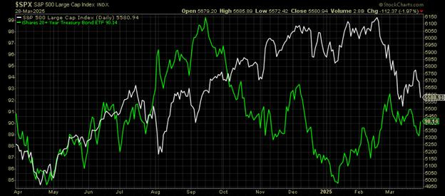 This is the chart of the S&P 500 (white) vs. long-term Treasury prices (green).