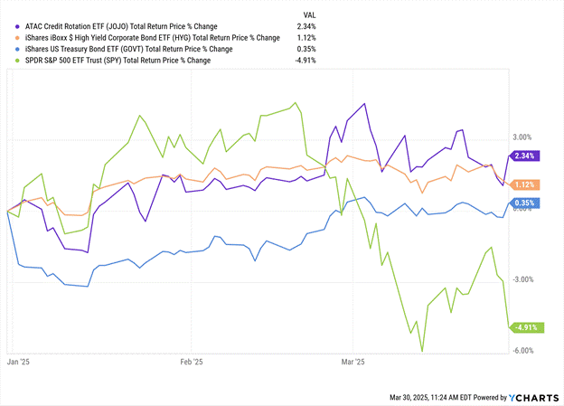 The ATAC Credit Rotation ETF (JOJO) pivots between junk bonds and Treasuries based on utilities relative to the broad stock market as a risk trigger. It’s a bond ETF that rotates offensively or defensively based on an historically proven leading indicator of volatility, with the goal of taking less risk at the right time.