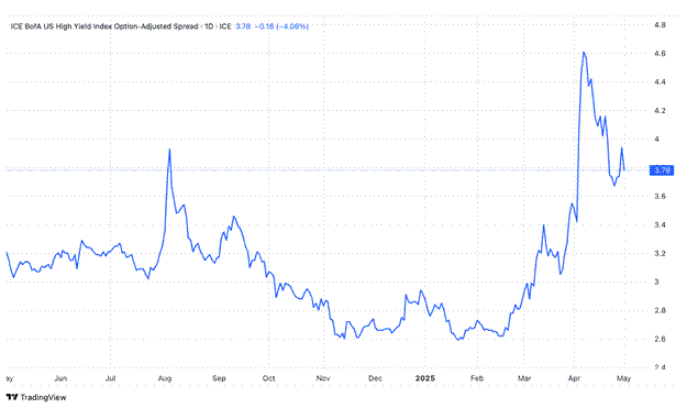 That easing is seen in the bond market as well. High yield spreads, which are a measure of how much yield above and beyond the risk-free rate that investors are demanding for taking on risk, has been in steady decline. Lower spreads are generally a sign of greater investor confidence.