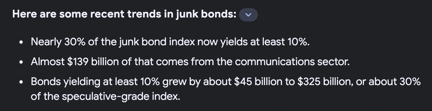 Cool! If you do the math, the current risk-free rate of 3-month Treasury bills is about 5.4%. The current spread on B-rated corporate debt is about 4.4%. Add those two numbers together and you get 9.8%, roughly the 10% benchmark mentioned above (it’s a very crude, back of the envelope calculation, but it should be directionally correct). We could deduce from this that nearly ⅓ of all outstanding junk debt is rated single-B or worse, which is not even close to the qualification for investment-grade. As economic conditions worsen and debt gets refinanced, we’re facing an environment where tens, if not hundreds, of billions of bonds risk falling into default.