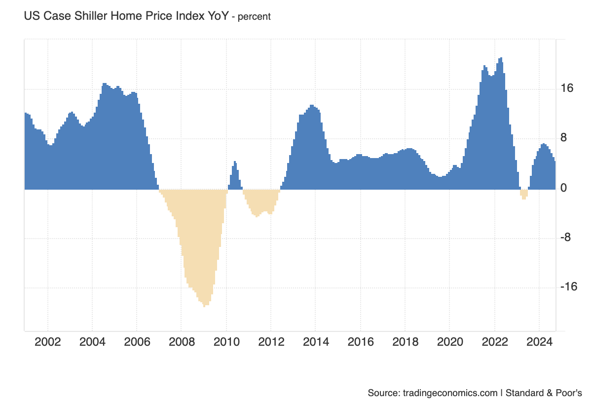 While they’ve come way down from their post-pandemic peaks, home price growth is still running at about 4% year-over-year. That’s likely to come down a bit over the next few months as price growth was negative in both August and September. There’s a seasonality factor at play here, so declining prices heading into the end of the year aren’t necessarily unusual, but it’ll be important to see a rebound after we move into 2025.