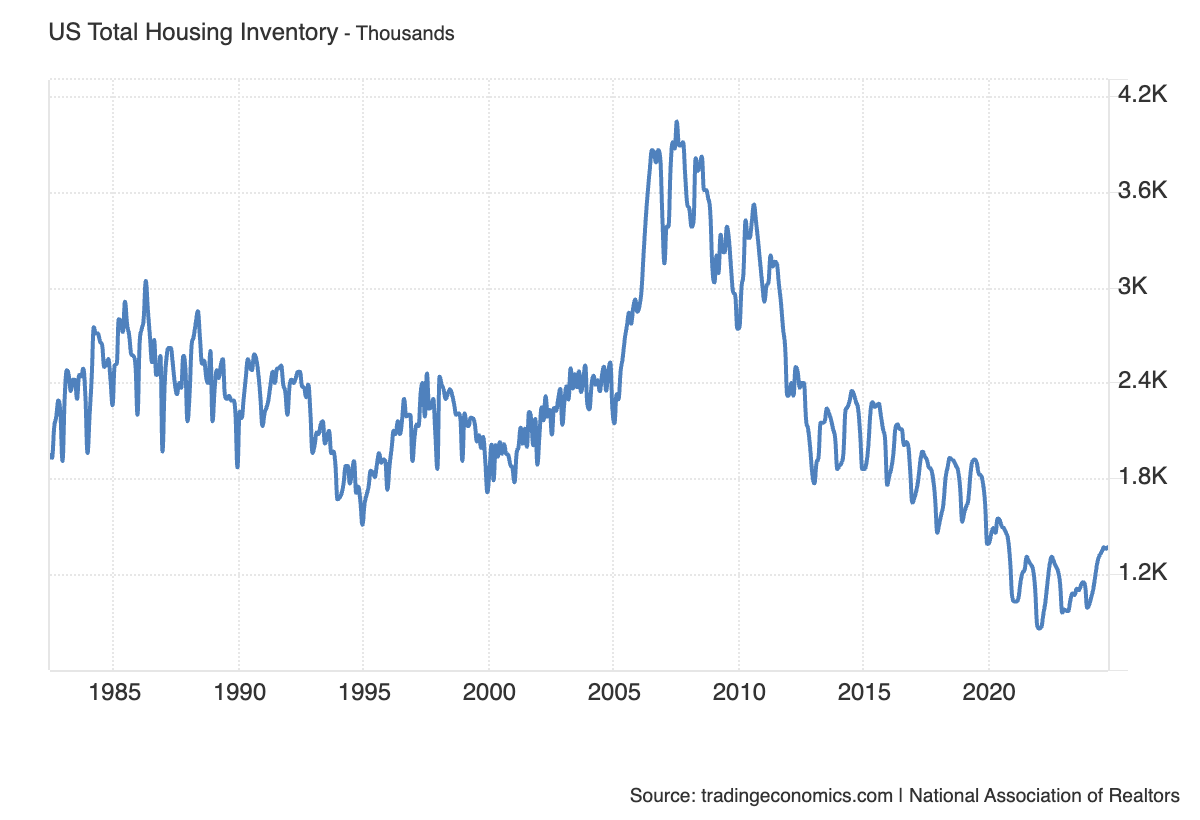 After the financial crisis in the late 2000s, housing supply returned back to historically normal levels by 2013. Once the COVID pandemic set in, a lot of people used their stimulus cash and low interest rates to either improve their existing houses or upgrade into new ones. Home prices soared and the supply of homes available for sale dropped dramatically. Supply is beginning to slowly pick up again, but it’s still got a long way to go to normalize.