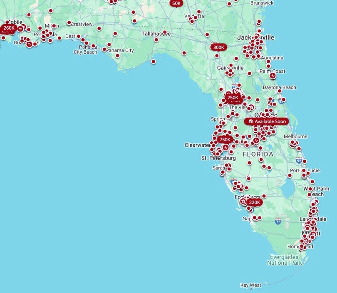 It’s a dot plot graph showing the concentration of homes for sale in Florida, whose number continues to grow. We know a lot of this is coming from the AirBnB bust, people who bought up houses for the purpose of renting them out and are now struggling to find renters. These folks could be getting crushed under a mountain of debt, especially if they bought multiple properties, and are scrambling to get out from under it.