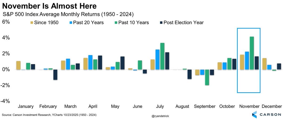 This pattern has inspired the familiar “Santa Claus Rally” narrative. Charts of long-term monthly returns consistently show November and December towering over other months. Even when markets have stumbled earlier in the year, this late-year stretch has frequently delivered a recovery as optimism builds around earnings, holiday spending, and the coming year’s outlook.