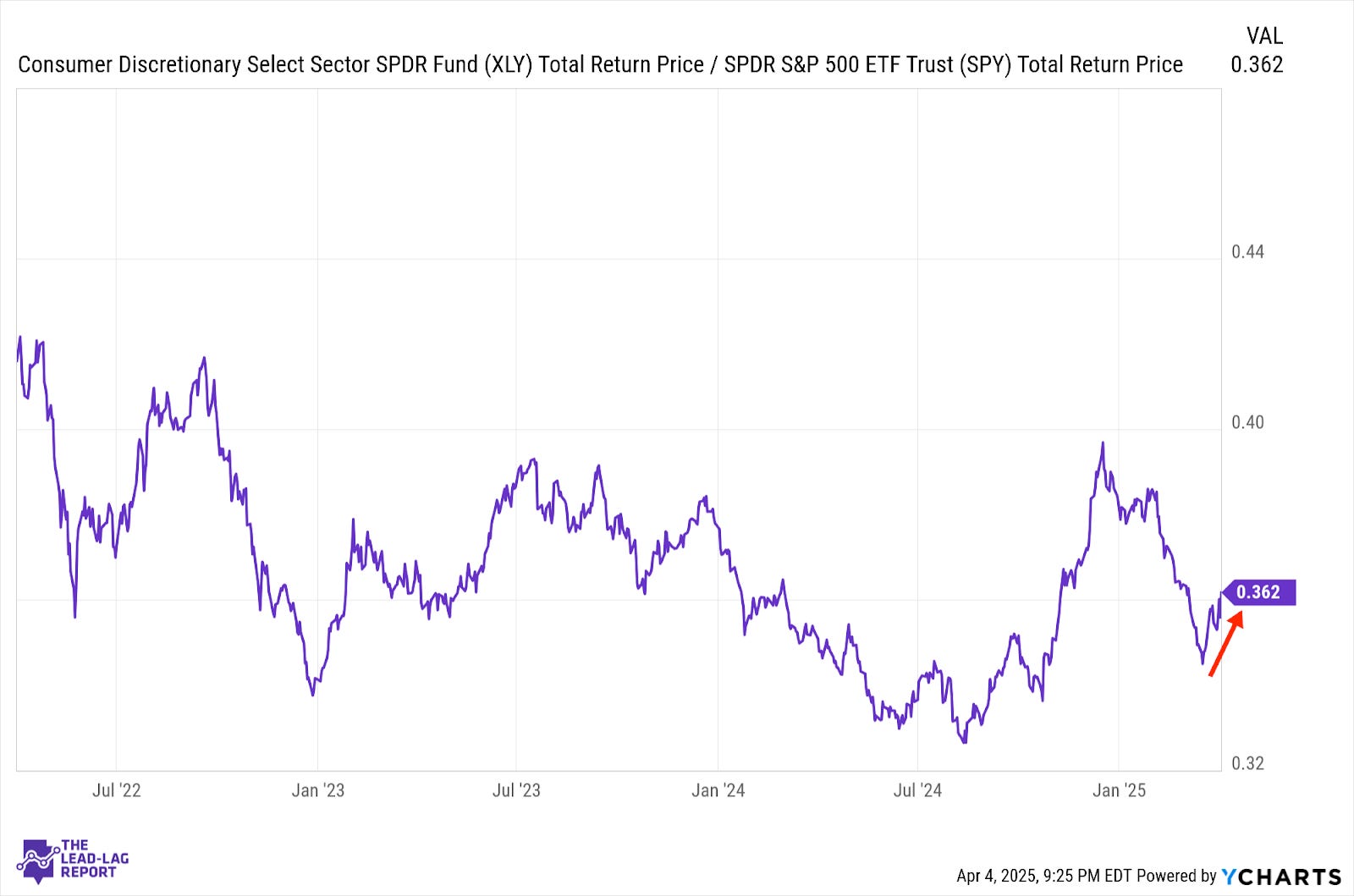 Discretionary stocks are starting to outperform again even though this sector could seemingly get hit harder by the impact of tariffs. One possible explanation is that the futures market is now pricing in four cuts instead of two and looser monetary conditions tend to benefit sensitive sectors more. It feels unlikely that this trend could continue given how discretionary spending should, in theory, be among the first things to go if prices rise and inflation heats up.