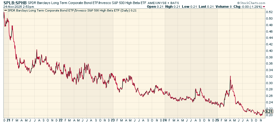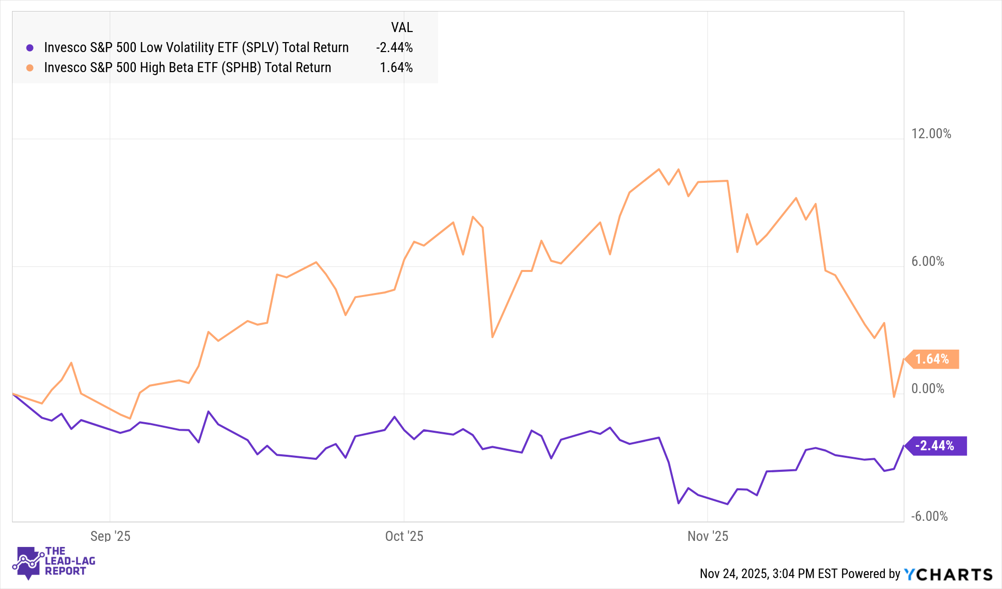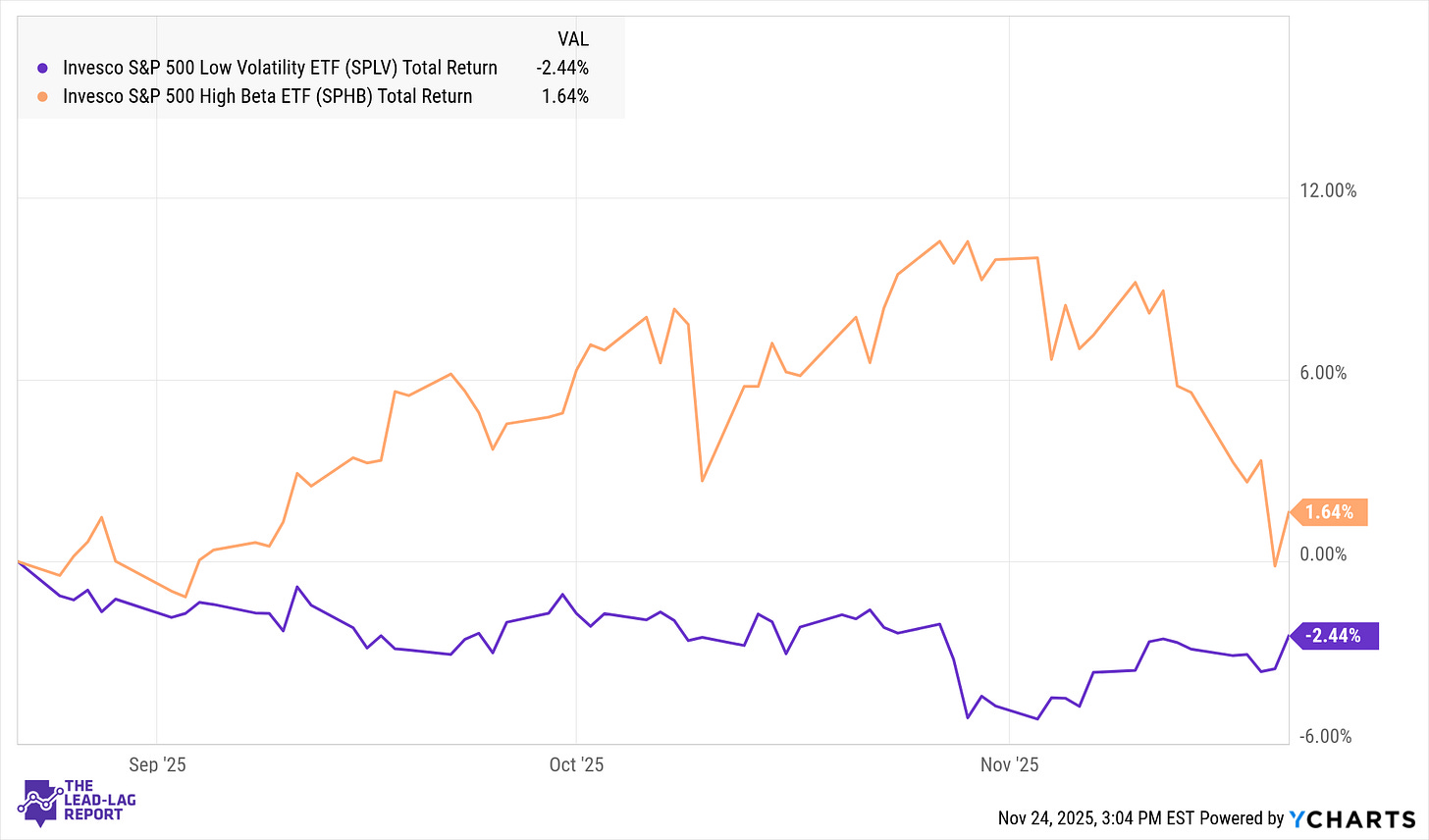 After years of pressure, the SPLV:SPHB ratio has begun to move higher. Low-volatility stocks have quietly outperformed, marking the first meaningful break in the multi-year downtrend.