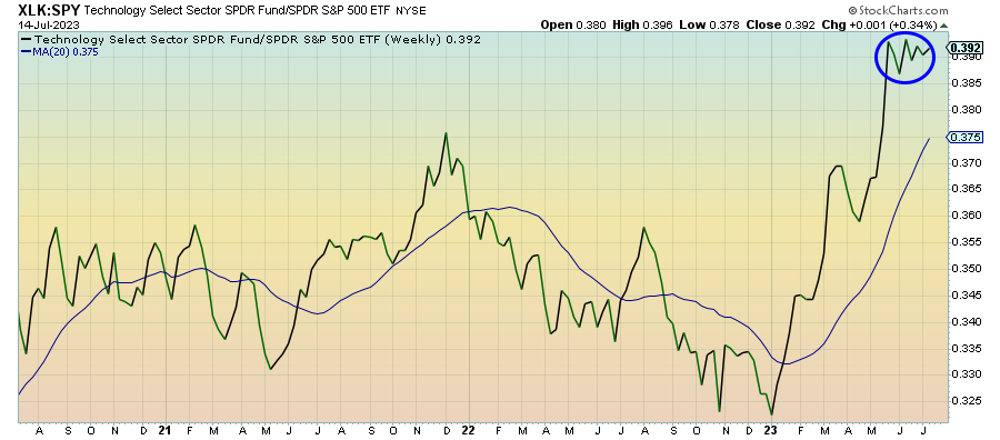 After flatlining like tech over the past month, this sector got another jolt in the arm thanks to June’s cool inflation reading. This could be an interesting sector to watch over the next few weeks. Stocks here are already overbought, valuations are way above historical averages and earnings growth expectations over the next couple quarters are high. That leaves little room for error on multiple fronts and could trigger the pullback that’s overdue.