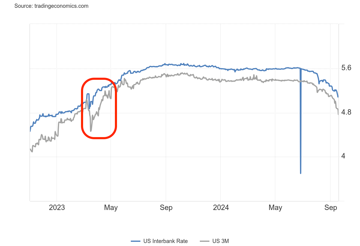 While this chart ends in 2021, we can use another source to identify how the interbank rate/T-bill rate spread correctly picked up on the regional banking crisis of 2023.