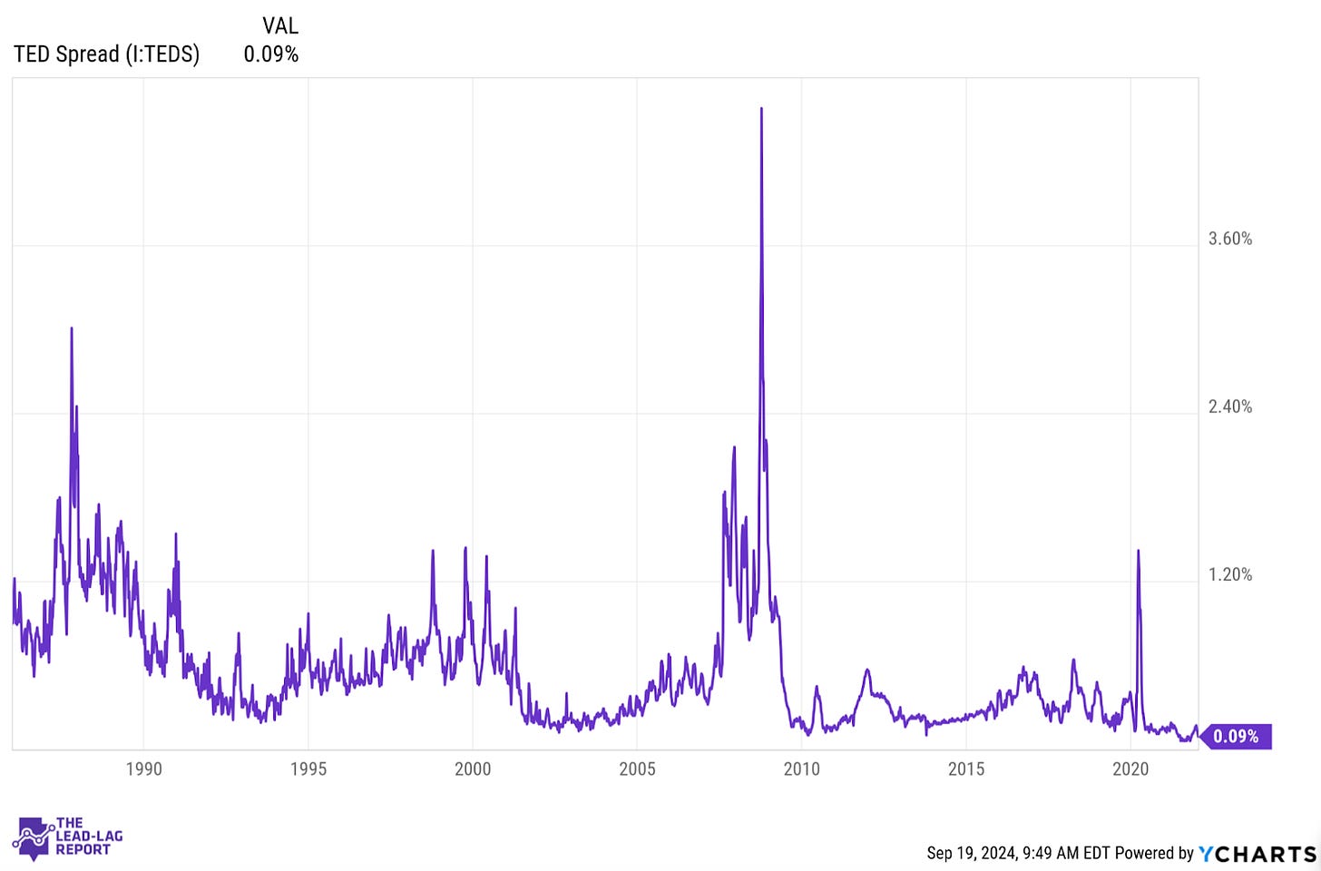 The TED spread mostly did a good job of signaling stress in the markets - 1987, 1990, the tech bubble, the financial crisis and the COVID pandemic. It also rose in more volatile, yet less prominent periods.