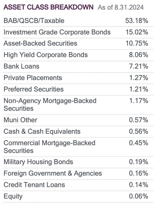As mentioned, a full half of the portfolio’s assets are currently dedicated to Build America Bonds. With the vast majority of the remainder of the fund’s assets going towards corporate bonds, bank loans and asset-backed securities, there’s relatively little here that’s producing tax-exempt income. There will be some tax benefit (approximately 56% of 2023 income was categorized as ordinary dividends), but it won’t provide the tax savings of a traditional muni fund.