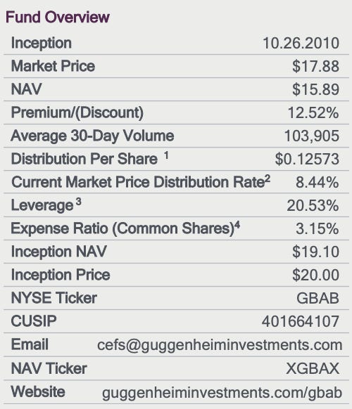 GBAB’s primary investment objective is to provide current income with a secondary objective of long-term capital appreciation. It seeks to achieve its investment objectives by investing primarily in a diversified portfolio of taxable municipal securities and other investment grade, income-generating debt securities, including debt instruments issued by non-profit entities, municipal conduits, project finance corporations, and tax-exempt municipal securities. The fund also utilizes leverage in order to enhance yield and total return potential.