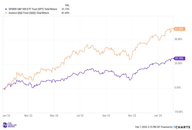 Of course, that’s the chart of the S&P 500 and Nasdaq 100 since the beginning of 2023. There’s little question that the latter part of that last statement is true. Investors have been optimistic almost to a fault and have shaken off virtually every warning sign and piece of bad news that’s been thrown at it. Is everything clicking? The major economic indicators - GDP growth, unemployment and the direction of inflation - would have you think so. GDP growth of more than 3% in the past year and an unemployment rate of less than 4% would certainly qualify as “clicking”. An inflation rate of 3% and a core inflation rate of 4% are higher than they should be, but the overall disinflationary trend has investors feeling like we’re at least heading in the right direction on that one.