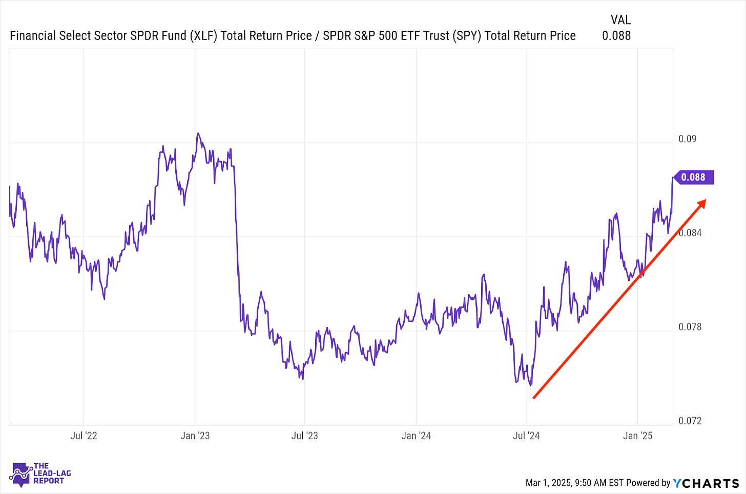 There have been ups and downs, but financials overall have been in an 8-month long uptrend. Plus, this ratio is now virtually all the way back to its pre-regional banking crisis highs. I think there’s definitely a deregulation tailwind helping out this sector, but the macro obstacles are starting to pile up.
