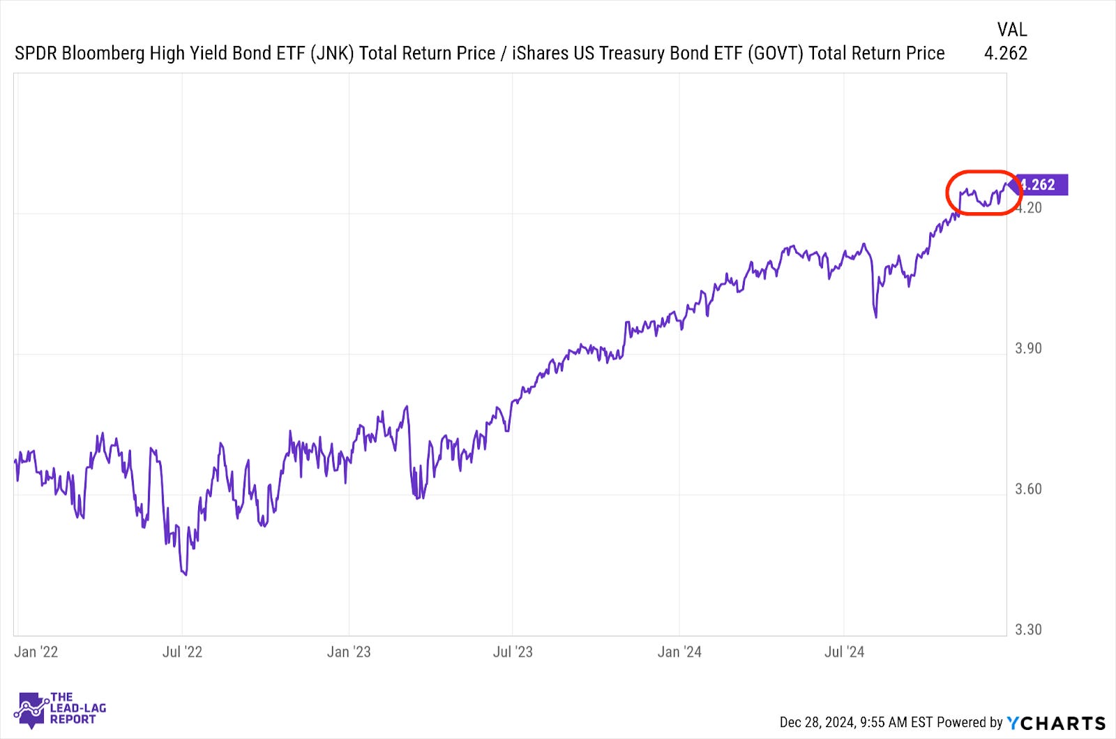 Junk bonds are approaching a potential inflection point. The rally in relation to Treasuries has progressed virtually non-stop (save for the pullback around the yen carry trade unwind) for nearly two years. Now, junk bonds may be topping as credit spreads begin moving higher. There’s a fairly easy argument to be made that conditions for lower-grade credit are already challenged, but high inflation and few, if any, Fed rate cuts could finally see that getting priced in.