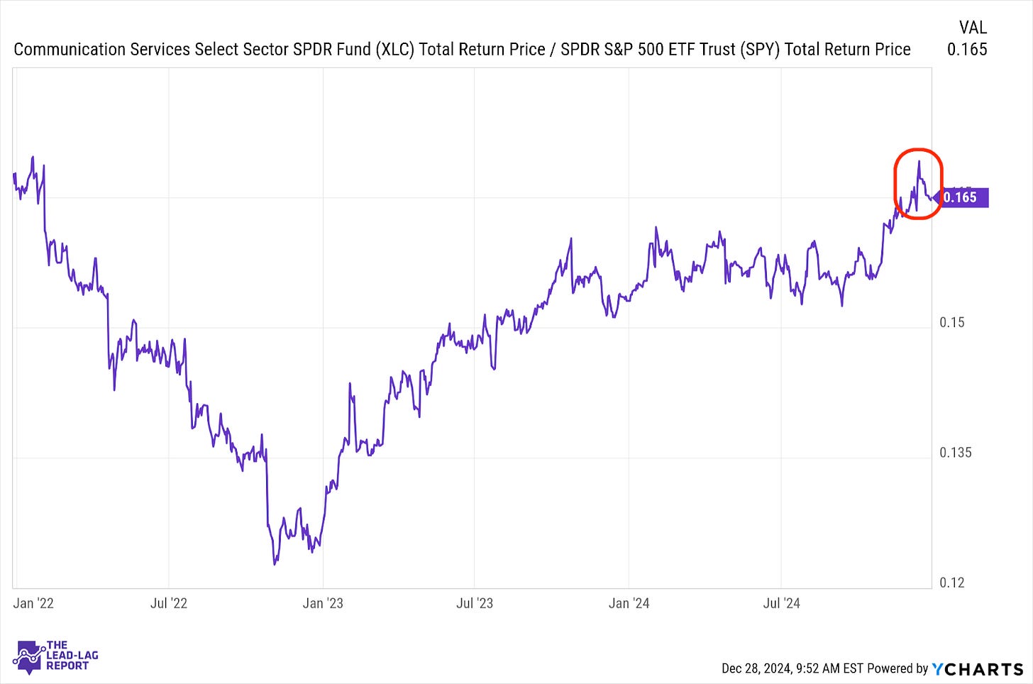 This sector is positioned to finish 2024 as the best performer, although narrow leadership is masking some underlying weakness. The equal weight version of this sector trailed the cap-weighted version by 17%, thanks to a big year for Facebook and modest outperformance by Alphabet. The traditionally more defensive telecoms were certainly a drag in a year that didn’t favor conservative equities.