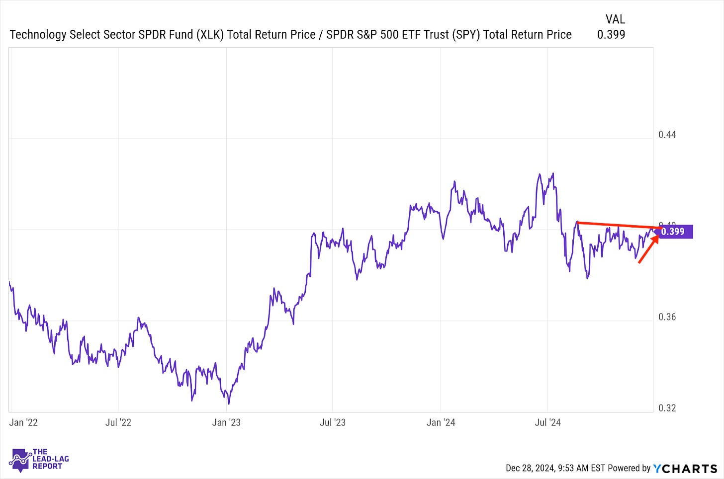 Tech has managed to outperform the S&P 500 in recent weeks, but it’s been struggling to recapture its previous leadership for nearly two years. The AI revolution could produce continued strength from the mag 7 stocks, but valuations are starting to get stretched. All of that infrastructure spending will need to pay off or we could see an unwind of some of those gains tied to AI potential.