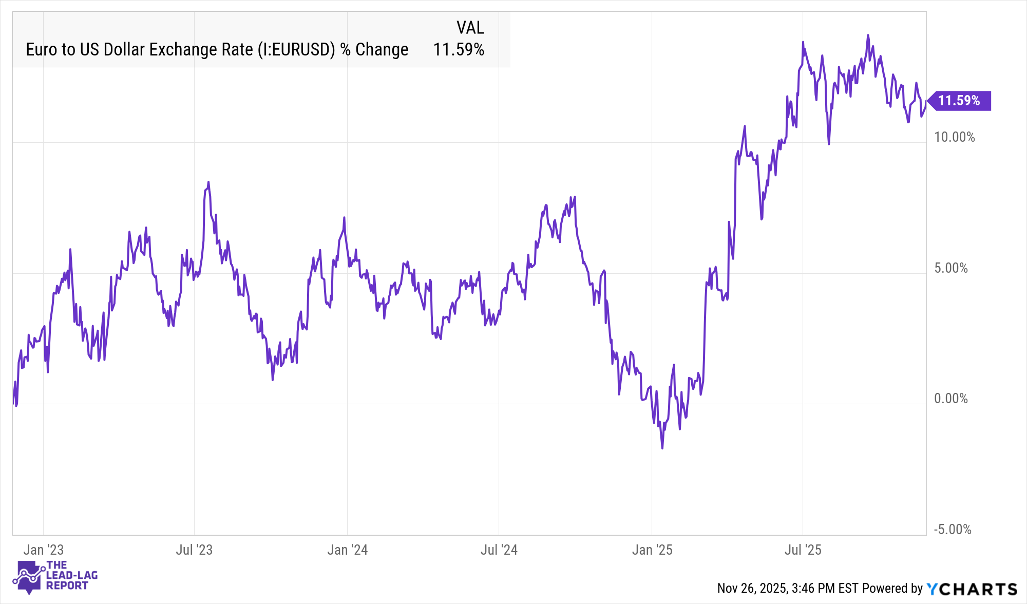 A stronger euro has reinforced the sense of stability. EUR/USD recently touched multi-month highs,¹⁶ supported by fading recession fears and a weaker U.S. dollar. Equity markets have responded positively, helped by lower energy prices and reduced concerns about a deep downturn. Still, expectations for 2026 growth remain modest.