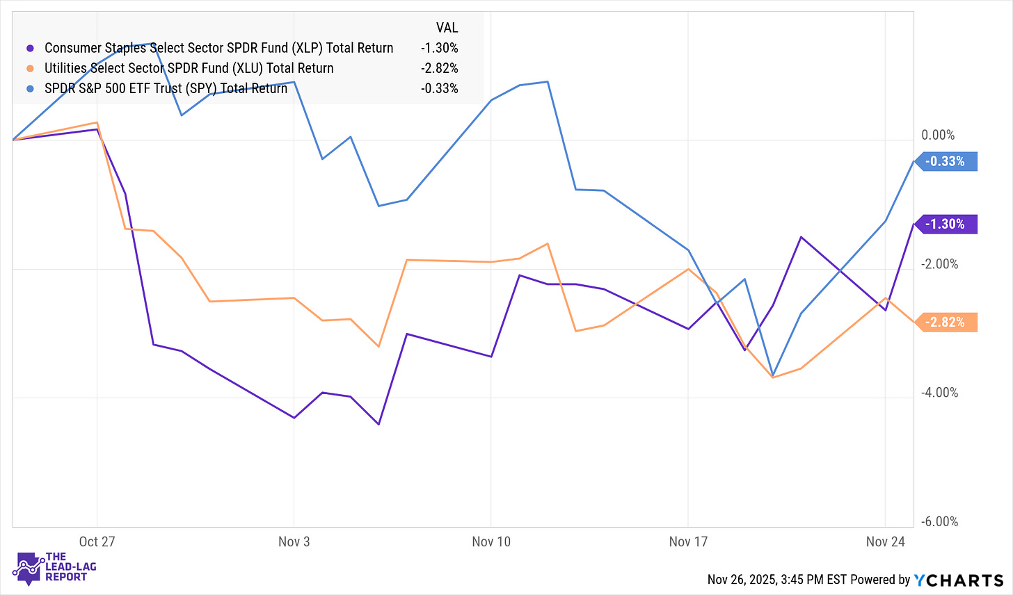 Equity leadership remains concentrated in mega-cap technology and communication services, while smaller companies have narrowed the gap only modestly. Growth stocks continue to outperform as falling yields boost longer-duration assets. Defensive sectors have also shown signs of life. Utilities and consumer staples—two groups that lagged for much of the year—have attracted renewed interest as investors quietly probe for safety.⁵